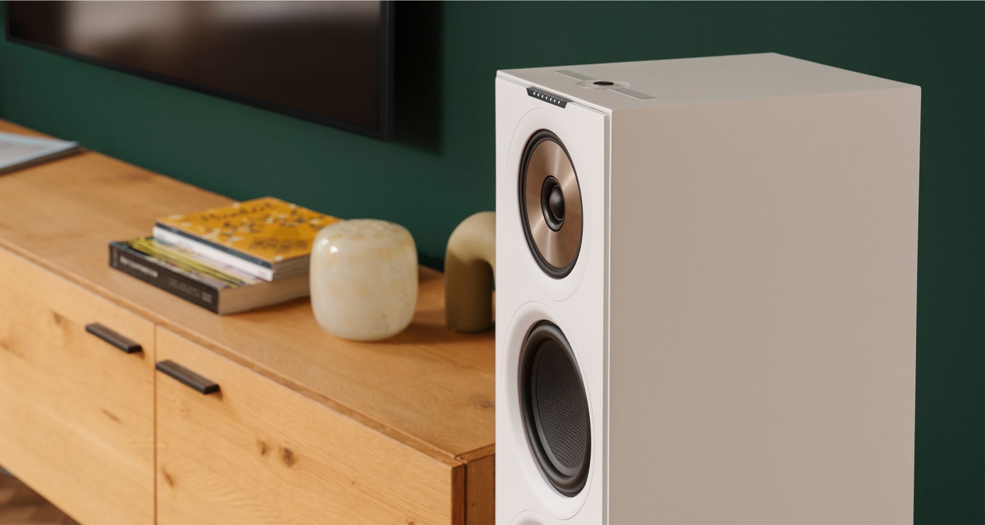 - Kabellose Verbindung zwischen den beiden Speakern, bei echtem, chirurgisch präzisem Stereo-Sound, Näherungssensor am Bedienfeld für Beleuchtung, Stationstasten, FSC®-zertifiziertes Holz, recycelte Stofffasern der Tönerabdeckung, moderner, edler Schleiflack